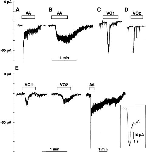 Figure 4. Inward currents in response to the amino acid cocktail (A and B). Inward currents in response to volatile odorant cocktail I (C) and cocktail II (D). All responses were recorded from different neurons (A∼D). (E) Inward currents in response to volatile odorant cocktail I, volatile odorant cocktail II, and the amino acid cocktail, respectively. The same inward current in response to the amino acid cocktail was shown with a short time scale in inset. All responses were recorded from the same neuron (E). The holding potential was −70 mV.