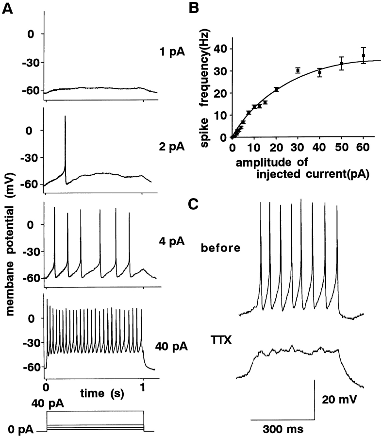 Figure 2. Current-clamp recordings from olfactory receptor neurons in the lateral diverticulum of Xenopus laevis. Current-clamp recordings showing the voltage responses to positive current injections from a conditioning potential of −60 mV (A). Above a certain threshold, repetitive action potential spikes were observed. The number next to the action potentials indicates the amplitude of currents injected. These traces were recorded from the same cell. (B) Spike frequency of olfactory receptor neurons as a function of current injection for six neurons that fired repeatedly. (C) An action potential recorded in response to a positive current pulse (40 pA) from the conditioning potential (−60 mV). This action potential response was reversibly blocked by 1 μM TTX.