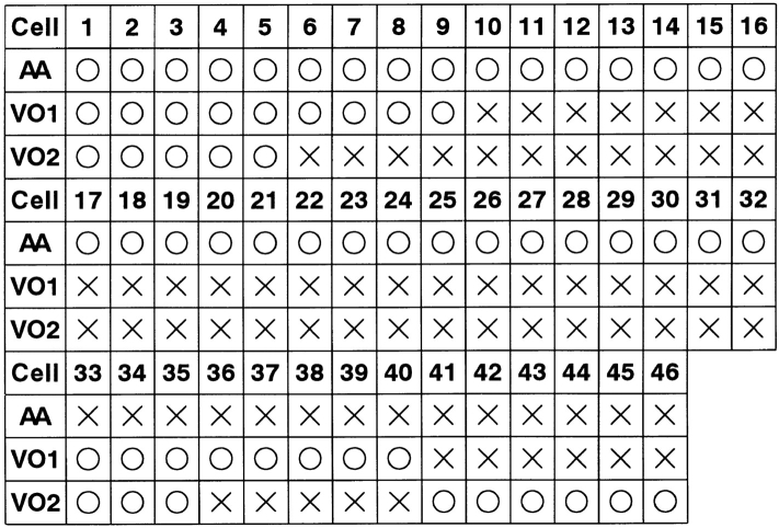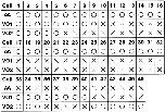 Figure 5. Response profile of single olfactory neurons to various odorants as obtained by the whole-cell clamp technique. The ○ and × indicate an inward current and no current, respectively, upon the application of odorants.
