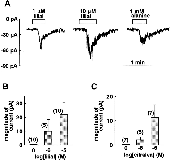 Figure 8. Inward currents in response to 1 and 10 μM lilial, and 1 mM alanine (A). All responses to each of the four traces were recorded from the same neurons. The holding potential was −70 mV. Mean magnitude of inward currents to lilial (B) and citralva (C) of varying concentrations. Each point is the mean ± SEM of data obtained from n preparations that responded to the odorants applied. The holding potential was −70 mV.