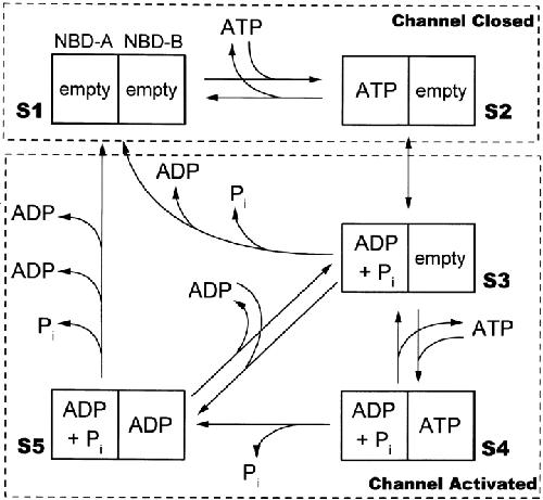 Zeltwanger, Gating of cystic fibrosis transmembrane conductance regulator chloride channels by adenosine triphosphate hydrolysis. Quantitative analysis of a cyclic gating scheme. 1999, Pubmed