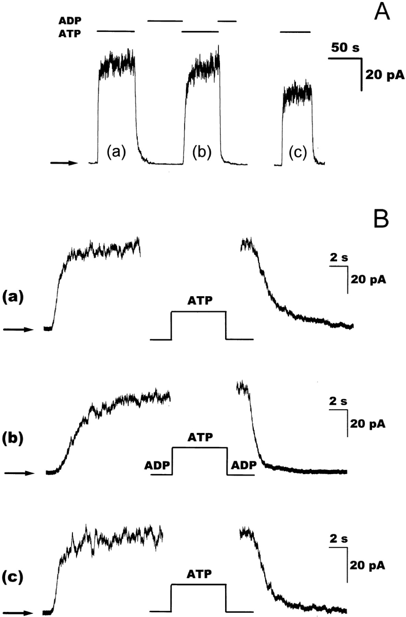 The CFTR chloride channel is regulated by phosphorylation by protein kinases, especially PKA, and by nucleotides interacting with the two nucleotide binding domains, NBD-A and NBD-B. Giant excised inside-out membrane patches from Xenopus oocytes expressing human epithelial cystic fibrosis transmembrane conductance regulator (CFTR) were tested for their chloride conductance in response to the application of PKA and nucleotides. Rapid changes in the concentration of ATP, its nonhydrolyzable analogue adenylylimidodiphosphate (AMP-PNP), its photolabile derivative ATP-P3-[1-(2-nitrophenyl)ethyl]ester, or ADP led to changes in chloride conductance with characteristic time constants, which reflected interaction of CFTR with these nucleotides. The conductance changes of strongly phosphorylated channels were slower than those of partially phosphorylated CFTR. AMP-PNP decelerated relaxations of conductance increase and decay, whereas ATP-P3-[1-(2-nitrophenyl)ethyl]ester only decelerated the conductance increase upon ATP addition. ADP decelerated the conductance increase upon ATP addition and accelerated the conductance decay upon ATP withdrawal. The results present the first direct evidence that AMP-PNP binds to two sites on the CFTR. The effects of ADP also suggest two different binding sites because of the two different modes of inhibition observed: it competes with ATP for binding (to NBD-A) on the closed channel, but it also binds to channels opened by ATP, which might either reflect binding to NBD-A (i.e., product inhibition in the hydrolysis cycle) or allosteric binding to NBD-B, which accelerates the hydrolysis cycle at NBD-A.