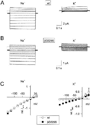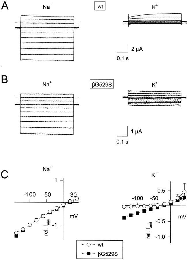 Figure 3. The βG529S mutant is partially permeable to K+. (A and B) Current traces of ENaC wt (A) and the βG529S mutant (B) in 40 mM Na+ or 120 mM K+ solution from two-electrode voltage-clamp recordings in Xenopus oocytes. Currents were measured during 500-ms voltage steps from a holding potential of −20 mV to test potentials of −140 to +40 mV in 20-mV increments. Currents measured in the presence of amiloride were subtracted from currents measured in the absence of 300 μM amiloride, and these subtracted currents are shown. The dotted line indicates zero level of the amiloride-sensitive current. (C) The current–voltage relationship of amiloride-sensitive Na+ and K+ currents obtained as described above are shown for wt and βG529S. For each oocyte, the amiloride-sensitive current was normalized to the INa at −100 mV. INa at −100 mV was 7.8 ± 2.4 μA for wt . |