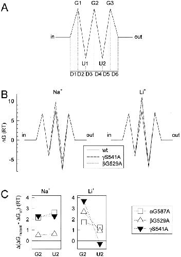 Figure 9. Energy barrier models of Na+ and Li+ permeation through open wt or mutant ENaC. (A) Parameters of the 3B2S model are represented and include: peak energies (G1-G3), well energies (U1, U2), and electrical distances (D1–D6). (B) Energy diagrams are drawn according to best-fit parameter values for the 3B2S model listed in Table . Profiles for wt (solid line), βG529A (dotted line), and γS541A (dashed line) are shown. (C) The ΔG changes relative to wt (Δ[ΔGmutant − ΔGwt]) of G2 and U2, the free parameters in the model fitting, are shown for αG587A, βG529A, and γS541A. |