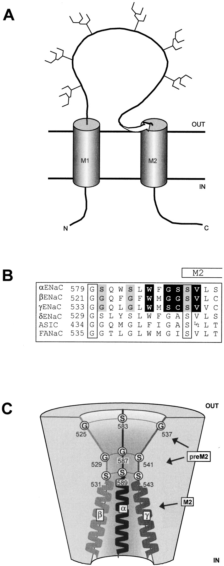 Figure 1. Sequence alignment and structural model of the pore region of ENaC. (A) Linear model of an ENaC subunit showing two transmembrane domains, M1 and M2, with a pre-M2 segment. (B) Sequence alignment of the pre-M2 segments of α, β, γ, δ ENaC, the ASIC family, and FANaC (FMRFamide peptide–gated Na+ channel; Waldmann et al. 1995a) (Waldmann and Lazdunski 1998; Tavernarakis and Driscoll 1997). The number of the first residue shown of rat α, β, γ ENaC, human δ ENaC, rat ASIC1, and FANaC is indicated. The putative start of M2, as predicted by the PHDhtm (transmembrane helix location) program at EMBL-Heidelberg, is indicated. The amino acid residues shown are identical within subunits across the species. Amino acid residues shown in open boxes are conserved across all known genes of the ENaC family. Amino acids analyzed in this study are shown in white on a dark background. Amino acids whose function has been analyzed in previous studies are shown in bold on gray background. αS583 and the homologous amino acid residues βG525 and γG537 change channel affinity for amiloride block (Schild et al. 1997). αS589 is a determinant of the geometry of the narrowest part of the pore (Kellenberger et al. 1999). (C) The cross-section shows the pre-M2 segments and the second putative transmembrane α-helices (M2) of an α subunit (black, center), a β subunit (gray, on the left) and a γ subunit (dark gray, on the right). The second α subunit located on the side of the viewer (Firsov et al. 1998) is not shown. The outer vestibule is lined by the pre-M2 segment where amiloride binds to αS583 and the corresponding Gly residues in the β and γ subunit (Schild et al. 1997). The vestibule narrows down to the selectivity filter formed by αG587, βG529, and γS541 residues and the ring of Ser residues (αS589 and analogues; Kellenberger et al. 1999). |