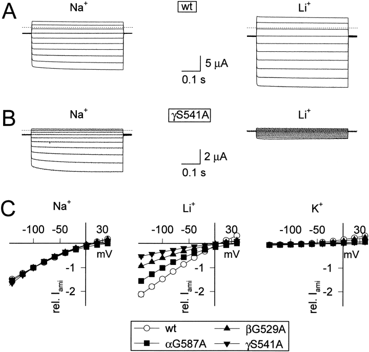 Figure 2. The macroscopic Li+/Na+ conductance ratio is decreased by mutations of homologous residues in α, β, and γ subunits. Current–voltage relationship of amiloride-sensitive currents in two-electrode voltage-clamp recordings from Xenopus oocytes. (A and B) Current traces of ENaC wt (A) and the γS541A mutant (B) in 40 mM Na+ or Li+ solution. Currents were measured during 500-ms voltage steps from a holding potential of −20 mV to test potentials of −140 to +40 mV in 20-mV increments. Currents measured in the presence of amiloride were subtracted from currents measured in the absence of 5 μM amiloride, and these subtracted currents are shown. The dotted line indicates zero level of the amiloride-sensitive current. (C) Current–voltage relationship in 40 mM Li+, 40 mM Na+, or 120 mM K+ bath solution from oocytes expressing wt, αG587A, βG529A, and γS541A mutant ENaC are shown. Recordings were obtained as described in A and B, with the exception that 250 μM amiloride was used to block βG529A currents. For each oocyte, the amiloride-sensitive current was normalized to the INa at −100 mV. INa at −100 mV was 13.9 ± 2.3 μA for wt . |