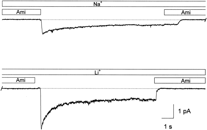 Figure 5. Amiloride-sensitive currents in macropatches from oocytes expressing the βG529S mutant. Subsequent application of extracellular Na+ and Li+ solution with and without 250 μM amiloride to an outside-out patch from an oocyte expressing βG529S ENaC. The holding potential was −80 mV. |