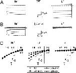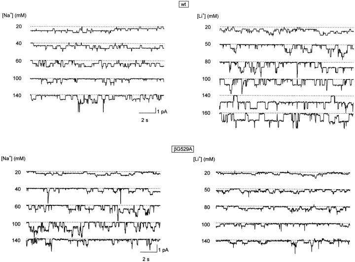 Figure 6. Ion concentration dependence of unitary currents of ENaC wt and βG529A. Single-channel recordings from outside-out patches from Xenopus oocytes at holding potentials of −130 (wt) or −150 (βG529A) mV in either Na+ or Li+ solutions. The numbers on the left side of the traces indicate the extracellular concentration of the permeant ion. Pipette solution was CsF/N-methyl-d-glucamine (see methods). |