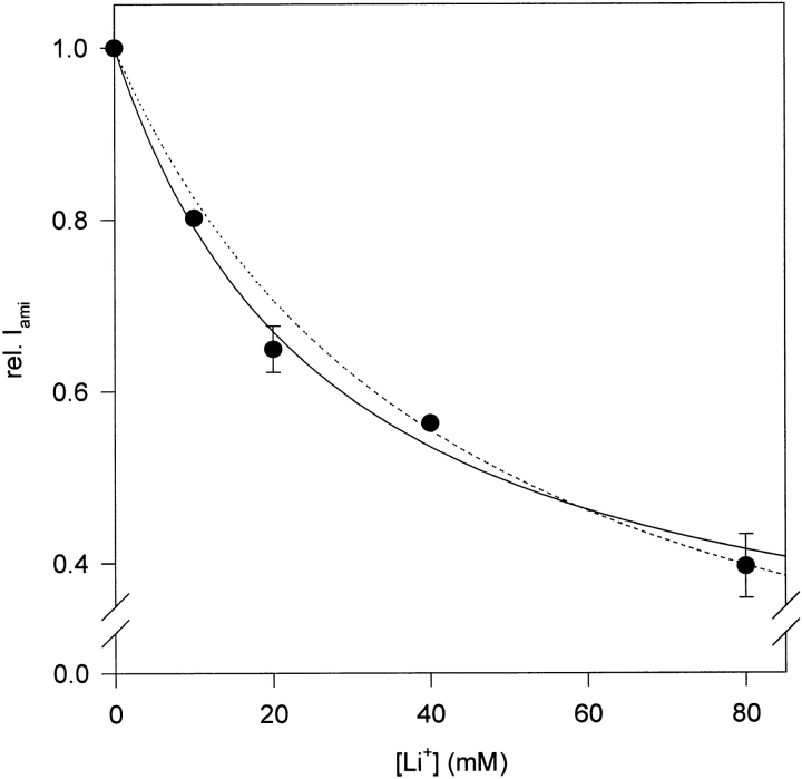 Figure 8. Block of Na+ current through γS541A ENaC by increasing concentrations of external Li+. Data are from outside-out macropatch recordings at a holding potential of −150 mV from Xenopus oocytes expressing γS541A. The bath solution contained 20 mM Na+ and increasing concentrations of Li+. The amiloride-sensitive currents were normalized to the condition without Li+ yielded an apparent Ki of 28 mM and is shown as a solid line. The prediction by the 3B2S model (see Table and methods) is shown as a dotted line. |
