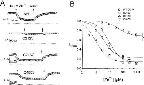 Figure 3. Sensitivity of wild-type ClC-0 and cysteine mutants to extracellular Zn2+ inhibition. (A) Inhibition by 10 μM extracellular Zn2+ on the steady state current of the wild-type channel (WT), C212S, C213G, and C480S. Down- and upward arrows indicate the application and washout of 10 μM Zn2+, respectively. Dotted lines represent zero-current level. (B) Dose-dependent inhibition of Zn2+ for the four channels shown in A. All data points were the average of 3–11 determinations. The current amplitude was normalized to the value right before the application of Zn2+. Solid curves were drawn according to a Langmuir function: , with values of K1/2 and I∞: (wild type) 1.0 μM and 0.87; (C212S) 47.5 μM and 0.33; (C213G) 3.5 μM and 0.78; (C480S) 9.3 μM and 0.88. |