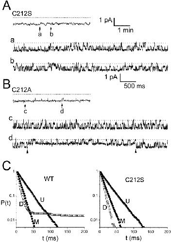 Figure 7. (A and B) Single-channel recordings of C212S and C212A. Continuous recording for 5 min in each case at a holding potential of −50 mV. The top of each panel is in a compressed time window. a–d are the recordings starting at the indicated points (arrows) with an expanded time window. The scale bars for the compressed and expanded time windows in A also apply to B. No inactivation event was discernible in both A and B throughout the whole recordings. Temperature was ∼23–24°C. (C) Comparison of cumulative dwell-time distributions of the events at conductance levels D (□), M (•), and U (▴) between wild-type ClC-0 (left) and C212S (right). The recording trace of the wild-type channel used for analysis is the same as the 4-min trace in Fig. 6 A. For C212S, the analyzed trace is the first 4-min recording shown in A. All events in each of the three levels were used for analysis. The numbers of events in levels D, M, and U are: (wild type) 1,399, 7,009, and 5,612; and (C212S) 1,731, 7,822, and 6,092, respectively. |