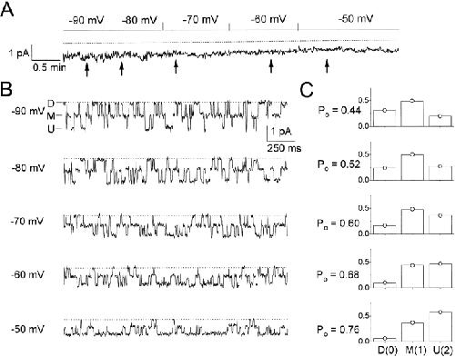 Figure 8. Binomial distribution of the three current levels in C212S. (A) Continuous 6-min single-channel recording trace at various membrane voltages. Same channel as the one shown in Fig. 7 A. The recording at −50 mV corresponds to the first ∼100-s recording in Fig. 7 A. (B) Representative 2-s recording traces starting at the positions indicated by arrows in A. (C) Open probability of the fast gate (Po) and the probabilities of the three current levels, fD, fM, and fU, at membrane potentials from −90 (top) to −50 (bottom) mV. The analysis was made on the corresponding regions shown in A, with the length of each segment being: 44 s (−90 mV), 62 s (−80 mV), 70 s (−70 mV), 72 s (−60 mV), and 106 s (−50 mV). The measured state probabilities, fD, fM, and fU, are represented by bars, whereas ○'s denote f0, f1, and f2, the predicted values of state probabilities calculated from Po. |