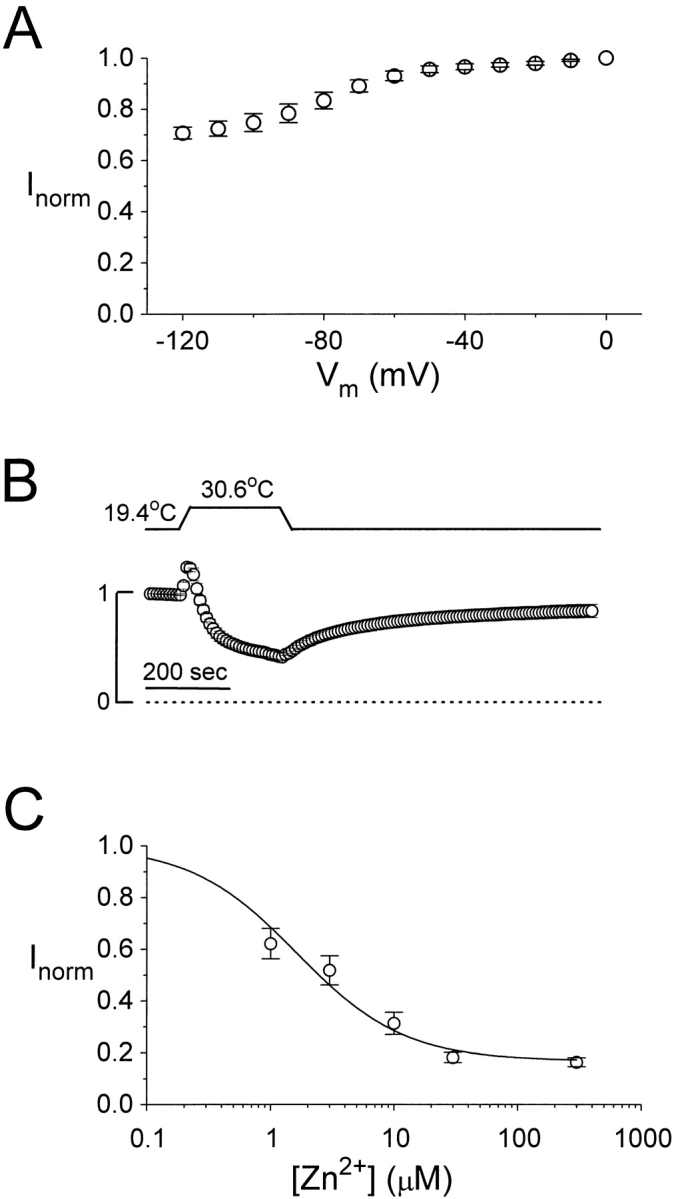 Figure 10. Probing the slow gate of S123T. (A) Quasi–steady state activation curve off the slow gate. (B) Temperature dependence of the macroscopic current from the whole oocyte. (C) Dose-dependent inhibition of the channel by extracellular Zn2+. The solid curve is drawn according to the Langmuir function described in Fig. 3, with K1/2 and I∞: 1.72 μM and 0.85 . |