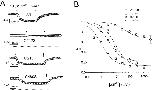 Figure 4. Temperature dependence of macroscopic current. The temperatures T1 and T2 were (°C): (A) Wild-type ClC-0, 22.0 and 28.7 . All current values were normalized to the amplitude of the first data point and the dotted lines represent the zero-current level. |