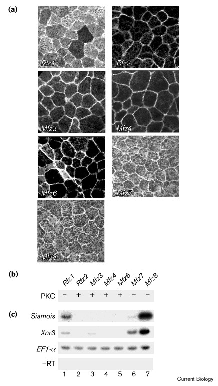 Frizzled homologs display a differential ability to increase PKC activity versus siamois and Xnr3 expression. (a) Both cells of two-cell Xenopus embryos were injected with XPKCα–Myc RNA along with RNA encoding Rfz1, Rfz2, Mfz3, Mfz4, Mfz6, Mfz7 or Mfz8 as indicated. The subcellular localization of ectopic PKC is shown. (b) PKC localization in animal cap cells from experiments as in (a) was imaged by confocal microscopy and quantified as in Figure 3. Frizzled homologs which showed less than 1.1-fold relative membrane versus cytoplasmic staining are denoted ‘−’, while Frizzled homologs which showed fivefold or greater membrane versus cytoplasmic staining are denoted ‘+’. (c) Frizzled homologs were assayed for the ability to increase siamois and Xnr3 expression in Xenopus embryos by RT–PCR amplification. EF1-α expression was measured as a loading control and −RT denotes this reaction without reverse transcriptase.