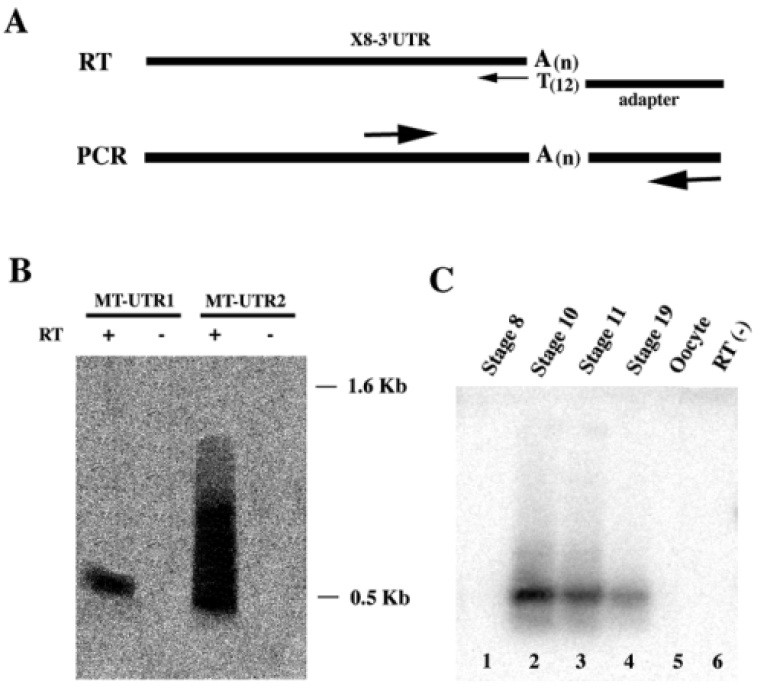 (A) RT-PCR assay for poly(A) tail length. RNA was reverse