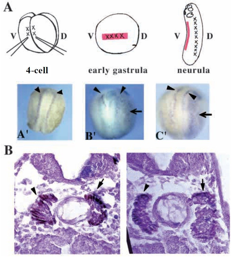 injected into the dorsal (DMZ) or ventral marginal zone (VMZ) of 4-cell embryos, which