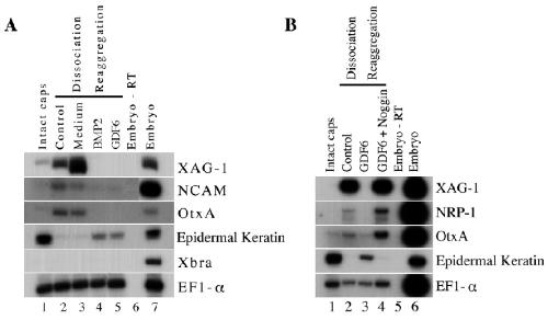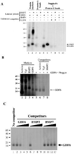 Fig. 6. (A) GDF6 binds specifically to noggin. Lanes 1 and 2 are
