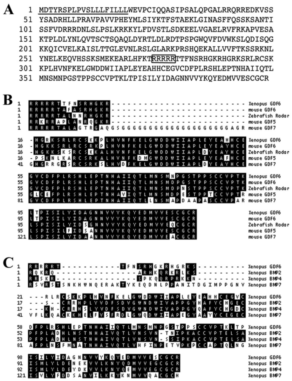 GDF6 is more than 90% identical to mouse GDF6. (C) GDF6 is homologous to BMPs.