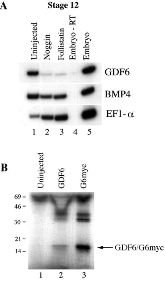 with RNAs encoding GDF6 (lane 2) or a myc-tagged GDF6 (G6myc,