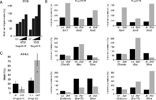 Fig. 3. Zic2 regulates Xnr expression during gastrulation. (A) Dose-dependent induction of Xnr5 by injected tZic2 RNA (330 pg, 660 pg, 990 pg) in whole embryos assayed by real-time RT-PCR. Un, uninjected embryo. (B) Expression of Xnrs, mesoderm and endoderm markers in control (Un) and Zic2-depleted (Zic2-; 5 ng oligo 10MP) embryos assayed by real-time RT-PCR at stage 10.25 (left panel) and stage 10.5 (right panel). (C) Increased activin-like activity in Zic2-depleted embryos. Mean relative luciferase units (RLU)=A3-luciferase activity (3Ã activin response element)/RLTK (Renilla luciferase, thymidine kinase promoter) activity. Error bars show s.d. in a representative experiment; the asterisk indicates statistical significance (P<0.05).