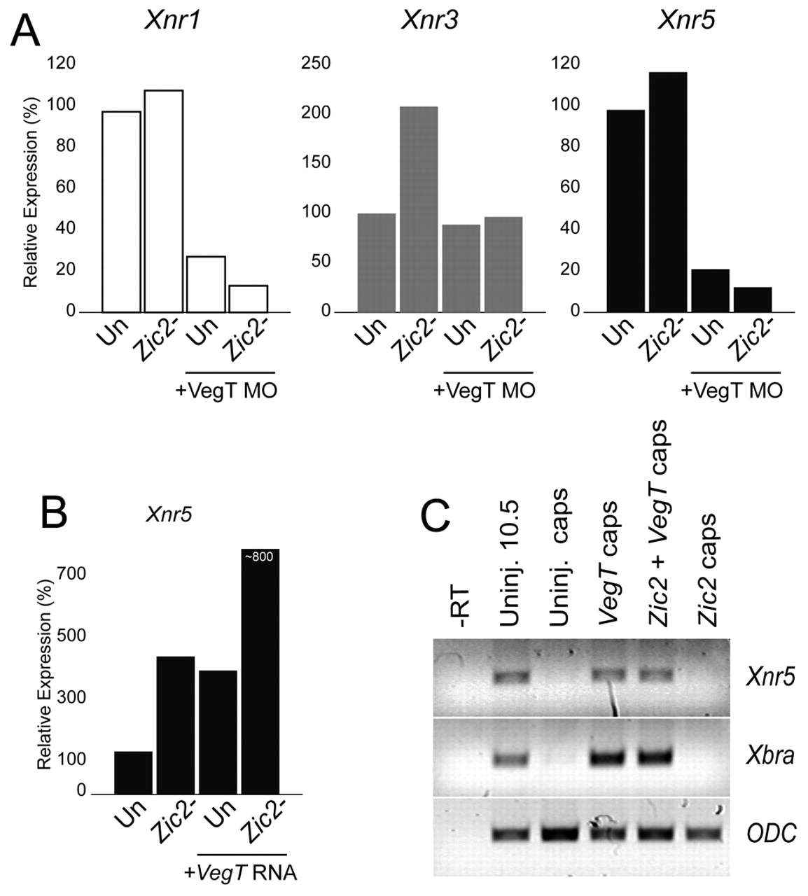 Fig. 7. Zic2 antagonizes VegT regulation of Xnr expression. (A) Expression of Xnr1, Xnr3 and Xnr5 in whole embryos at stage 10.5. Un, uninjected; Zic2-, 5 ng 10MP; VegT MO, 18 ng morpholino oligo. (B) Expression of Xnr5 in uninjected and Zic2-depleted embryos in the absence or presence of VegT mRNA (200 pg). Oligos were injected vegetally in A and Zic2 oligo and VegT RNA were injected animally in B. (C) Zic2 does not inhibit VegT in animal caps. Zic2 mRNA (500 pg), VegT mRNA (250 pg) or a combination of the two, were injected at the two-cell stage. Animal caps were dissected at the early gastrula stage and cultured for 2 hours.