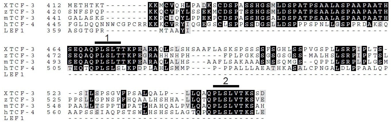 Fig. 6. Amino acid sequence comparison of the C-terminal region of Xenopus, zebrafish and mouse Tcf-3, human Tcf-4 and human LEF-1.