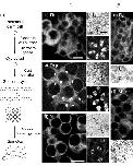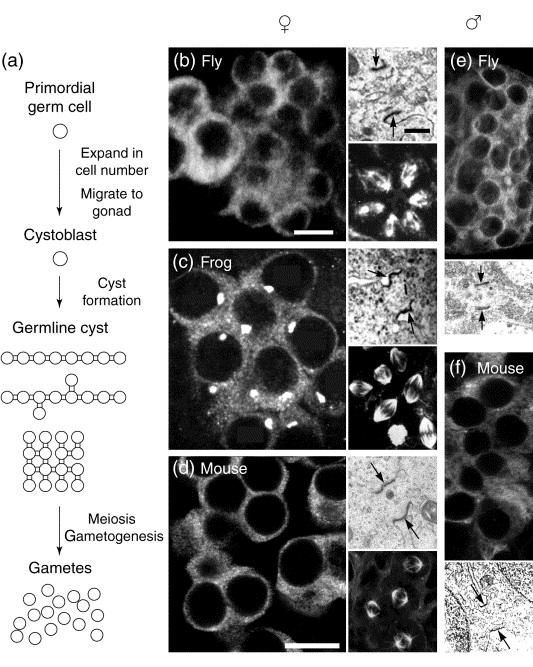 Germline cysts in Drosophila, Xenopus and mouse. (a) Timeline of germ cell development. Germ cells in many species follow a similar path of development. Primordial germ cells increase in number by mitotic division and migrate to the gonad during development. Cyst founder cells (called cystoblasts in the Drosophila females) divide several times followed by incomplete cytokinesis to form a germline cyst of 2n connected cells. In some organisms such as the mouse female, this process occurs only in the embryonic gonad, whereas, in other organisms such as the Drosophila female, this process occurs in the adult gonad. The germ cells then enter meiosis and will eventually develop into mature gametes. (b) Portions of 2â3 germline cysts from a Drosophila ovary stained with VASA antibody (a germ cell marker). (c) A germ cell cluster from a developing Xenopus ovary stained with XGAM antibody, which is specific for gamma-tubulin (image reproduced, with permission, from Ref. 13). (d) Portions of 2â3 germline cysts from a 13.5 days post coitum (dpc) mouse ovary stained with mouse VASA antibody (the antibody was a gift from T. Noce). (e) Portions of 2â3 germline cysts from a Drosophila testis stained with VASA antibody. (f) Part of a germline cyst from a mouse testis stained with mouse VASA antibody. Top insets (bâd) and insets (e) and (f) are electron micrographs from each species showing an intercellular bridge (arrows) connecting two germ cells (images reproduced, with permission, from 3; 10 ; 51; bar, 1 μm). Bottom insets (bâd) show the mitotic synchrony of cyst-forming divisions from each species (images reproduced, with permission, from 11; 13 ; 19). All the electron micrographs are presented at the same magnification. Note the similarity in size of the ring canals in different species. Bars in (b) [for (b) and (e)] and (d) [for (d) and (f)], 10 μm.