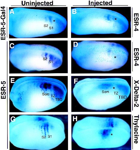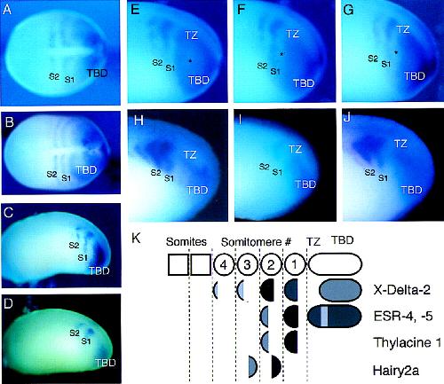 Expression of ESR-4 and ESR-5 inXenopus embryos. (AâD) Xenopus embryos at different stages were stained for the expression of ESR-4 andESR-5 with whole-mount, in situ hybridization. All embryos are oriented in this figure as in subsequent figures with anterior to the left. (A) Expression of ESR-5 at late gastrulae stage (st. 12, dorsal view), (B) at early neurulae stage (st. 14/15, dorsal view), and (C) at late neurulae stage (st. 22/24, side view). (D) Expression ofESR-4 at late neurulae stage (st. 22/24, side view). Note that the expression patterns of both ESR-4 andESR-5 at these different stages consists of a TBD, and two stripes that lie anterior to the TBD in somitomere 1(S1) and 2(S2). The expression patterns of ESR-4 and ESR-5 differ only in one respect: The TBD staining for ESR-5 is more intense and tends to extend more rostrally than that of ESR-4. (C,D; also see Fig. C,I). (EâG) Three examples ofESR-5 staining taken from a batch of embryos processed at stage 22. Side views of the posterior third of the embryos are shown. The asterisk marks what appears to be the emergence of a gap in the TBD expression of ESR-5 in a region referred to as the TZ. (HâJ) Double labeling of embryos with whole-mount in situ hybridization with probes for ESR-5 and X-Delta-2. (H) Embryo stained for X-Delta-2 alone with MagentaâPhos (MP) as the chromogen, (I) ESR-5 RNA alone with BCIP, or (J) both ESR- 5 with BCIP andX-Delta-2 with MP. Note that the ESR-5 staining in S1 overlaps with the S1 staining in X-Delta-2. (K) Diagram showing the position of ESR-4 and ESR-5expression relative to that of other genes known to be expressed segmentally in Xenopus embryos (Jen et al. 1997; Sparrow et al. 1998). Because cells are constantly being added posteriorly to the paraxial mesoderm and somites are constantly forming anteriorly, the stripes of gene expression in the somitomeric region represent transient expression in groups of cells as they pass through this domain. For this reason, the S1-4 notation in this and other figures does not denote a fixed group of cells along the AP axis, but rather to different stages of the segmentation process that cells pass through in the paraxial mesoderm. |