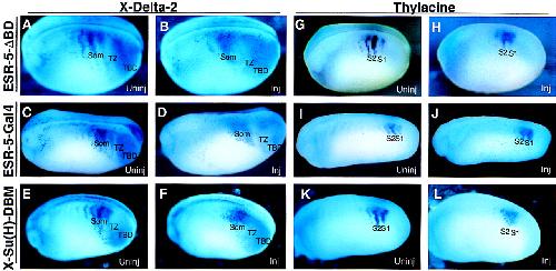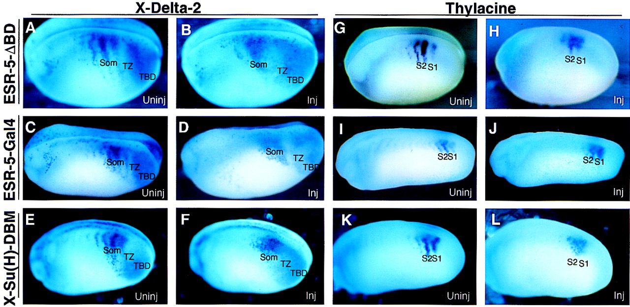 Negative feedback represses Notch pathway genes in the TZ. Embryos at the two-cell stage were injected on one side with RNAs encoding ESR-5ΔBD (A,B, G,H), ESR-5–Gal4 (C,D,I,J), or X-Su(H)–DBM (E,F,K,L), and then processed at stage 22/26 for the expression ofX-Delta-2 (A–F) or Thylacine1(G–L). A representative embryo from each injection is shown with a view of the uninjected (uninj) or injected side (inj). (Som) somitomeric. |