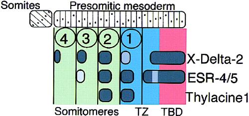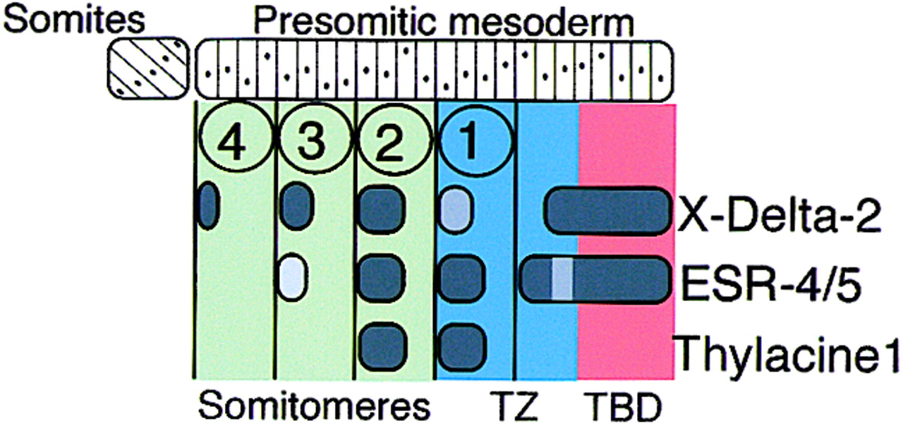 Model for Xenopus vertebrate segmentation. Segmental regulation of Notch pathway genes in the paraxial mesoderm ofXenopus embryos. The presomitic mesoderm of Xenopusembryos can be divided into three regions, TBD (red shading), TZ (blue shading), and somitomeric region (green shading) in which the Notch pathway is regulated by different factors. The Notch pathway is active when paraxial cells are in the TBD but is repressed in posterior half- segments when cells enter the TZ. This repression is likely to be due to several factors including negative feedback via ESR-5, as well as segmental repressors such as the Hairy-oscillator. At this point in the process, Notch signaling acts to establish segment size by restricting the domain in which the Notch pathway genes are active. In the somitomeric region, Notch signaling appears to take on another role in which ESR-5 appears to promote the expression of Thylacine1and X-Delta-2 in a positive feedback loop. Positive feedback would act to maintain segmental identity by preserving the domains in which Notch signaling occurs. |