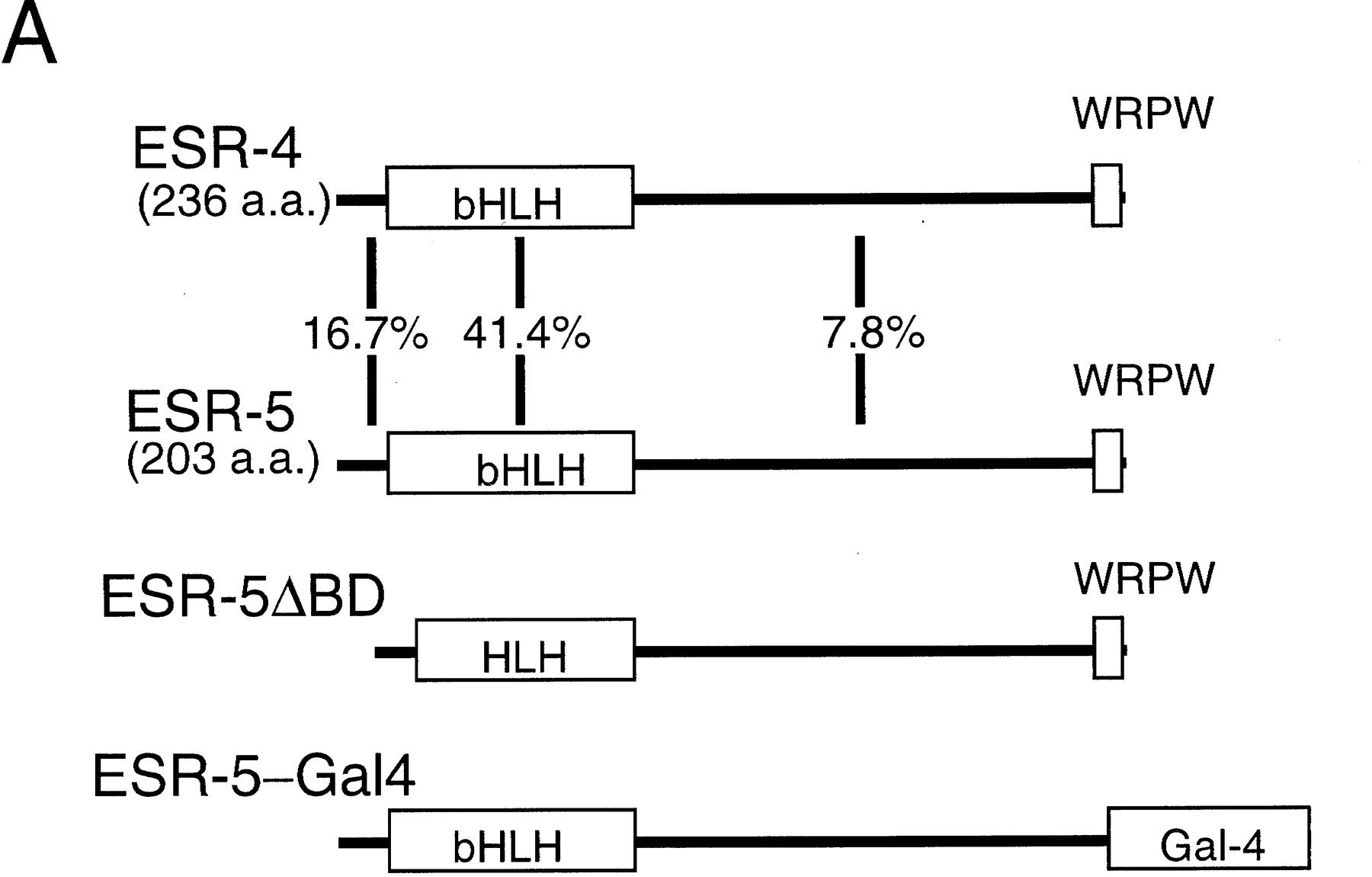 Structural features of ESR-4 and ESR-5. (A)ESR-4 and ESR-5 encode closely related WRPW–bHLH proteins. The two bottom diagrams illustrate the mutant forms of ESR-5 that were generated by removing the basic domain, or by replacing the WRPW with the activation domain from Gal4. (B) Phylogenetic tree showing the sequence relationships of ESR-4 and ESR-5 to vertebrate WRPW–bHLH proteins recorded in the GenBank database, including those isolated from Xenopus, ESR-1/X–Hairy1/X-Hairy2A; zebrafish, zfHer1/ZfHer6; rat, rHES-1/rHES-2/rHES-3/rHES-5; chick: c-hairy1; and Drosophila, DmHairy1/Espl (m8). |