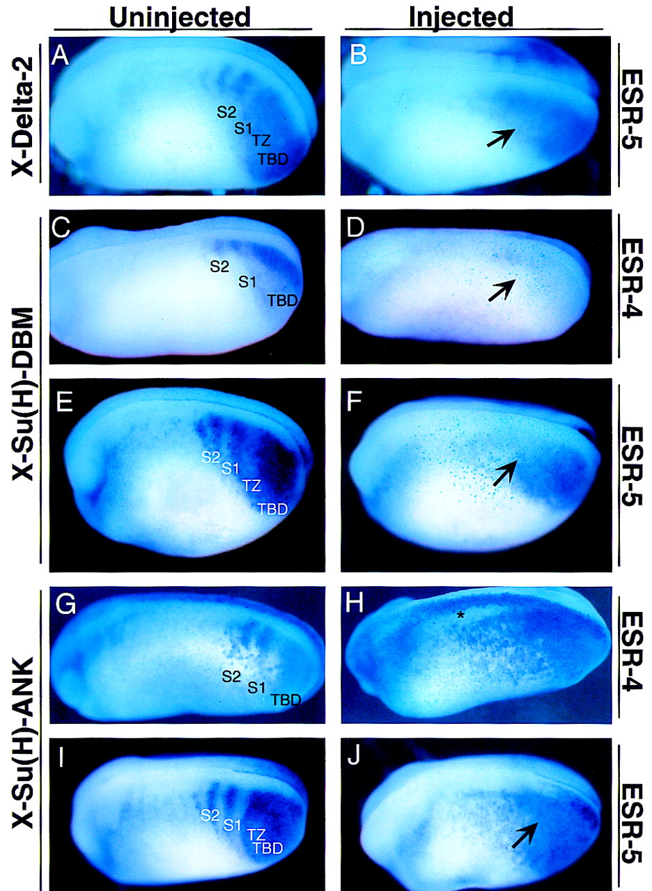 Expression of ESR-4 and ESR-5during segmentation depends on the Notch signaling pathway. Embryos were injected on one side with RNAs encoding X-Delta-2(A,B), X-Su(H)–DBM (C– F), or X-Su(H)–Ank (G–J), and processed for expression of ESR-4(C,D,G,H) or for ESR-5 (A,B,E,F,I,J). A representative embryo from each injection is shown with a view of the uninjected or injected side. (A,B) Note that when embryos ectopically express X-Delta-2, expression of ESR-5 in the TZ increases (B, arrow). X-Su(H)–DBM completely blocksESR-4 expression (D, arrow) while significantly reducing ESR-5 expression in the somitomeric and TZ region (F, arrow). X-Su(H)–Ank expands the expression of bothESR-4 (H) and ESR-5 (J, arrow). The asterisk in H marks ectopic induction of ESR-4expression in the neural tube by X-Su(H)–Ank. |