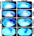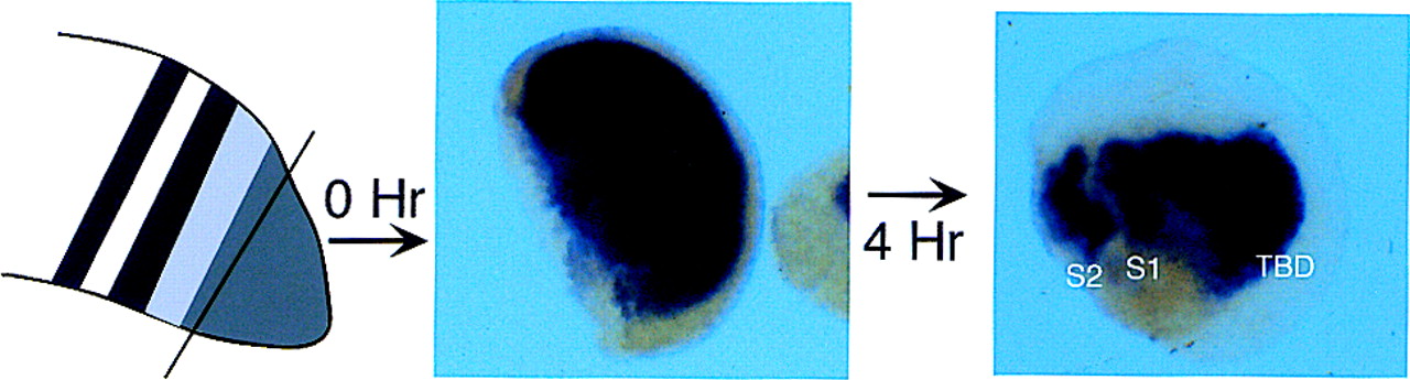 Segmental expression of ESR-5 is generated by mechanisms intrinsic to TBD. The TBD was dissected from a collection of embryos and either fixed immediately (0 hr) or left for 4 hr in culture and then fixed (4 hr). After staining for ESR-5expression, embryos were scored on the basis of the presence of stripes and gaps (see Table ). Shown are representative samples after clearing in benzyl benzoate. Identical results were obtained forESR-4. |