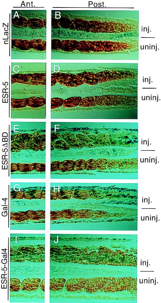Altered activity of ESR-5 produces somite defects in Xenopus embryos. Embryos were injected withlacZ RNA alone (A,B) or along with RNAs encoding ESR-5 (C,D), ESR-5ΔBD (E,F), Gal-4 (G,H), or ESR-5–Gal4 (I,J). Embryos were processed at tadpoles stages by fixation, then staining with X-gal and 12/101. Shown are longitudinal sections of the processed embryos, in which the right panels are taken from the region of the paraxial mesoderm where somites are just forming, whereas theleft panels are taken from a region more anterior. Note that in embryos injected with lacZ alone (A,B) or with Gal4 as a control (G,H), expression of 12/101 is initiated prior to somite formation and, after somites form, the myotomal cells line up along the AP axis with their nuclei aligned along the middle of each somitic unit. In contrast, embryos injected with ESR-5 (C,D), ESR-5ΔBD(E,F), or ESR-5–Gal4 RNA (I,J), 12/101 expression is initiated on schedule, but the myotomal cells fail to organize into a segmental pattern. In the more extreme cases, such as ESR-5–Gal4, the myotomal cells do not show signs of initiating somite formation (J). |