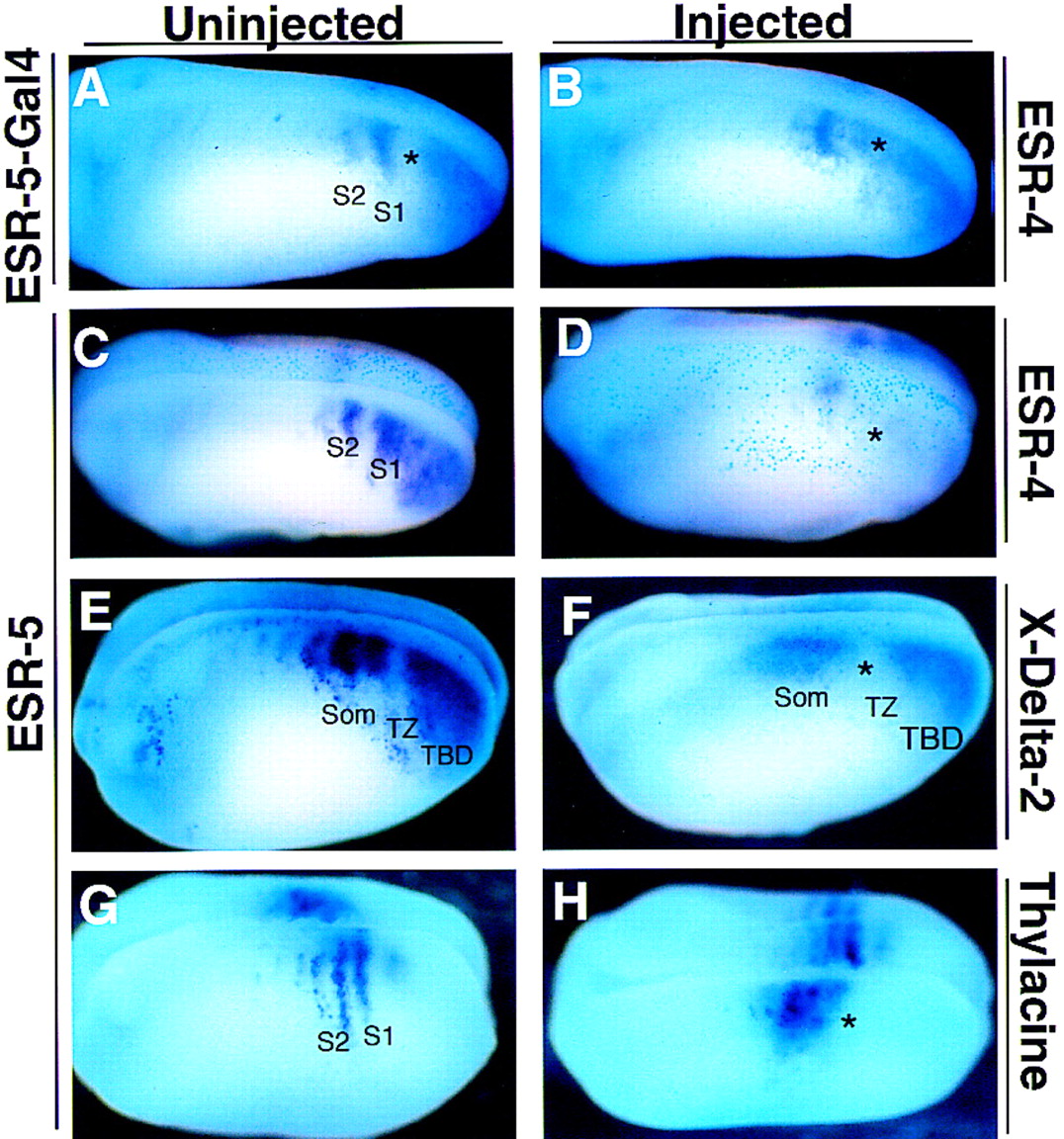 ESR-5 activity alters segmental gene expression. Embryos at the two-cell stage were injected on one side with RNAs encoding ESR- ESR-4 (A–D), X-Delta-2(E,F), or Thylacine1 (G,H). A representative embryo from each injection is shown with a view of the uninjected or injected side. |