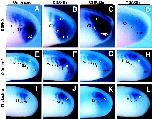 CHX and TSA treatment rapidly alter the segmental expression of ESR-5, X-Delta-2, andThylacine1. Xenopus embryos at early neurulae stages were left untreated (A,E,I), or treated for 1 hr (B,F,J) or 2 hr (C,G,K) with CHX, or for 2.0 hr with TSA (D,H,L). Embryos were then fixed and stained forESR-5 expression (A–D), X-Delta-2expression (E–H) or for Thylacine1 expression (I–L). A side, posterior view of the stained embryos is shown. Note that following 1 hr of CHX treatment, ESR-5,X-Delta-2, and Thylacine1 expression changes by upregulating in the TZ (asterisks), whereas the striped expression ofX-Delta-2, Thylacine1, and ESR-5 in the somitomeric region is relatively unaffected. Similar effects on the expression of these genes in the TZ also occur after 2.0 hr of TSA treatment. |