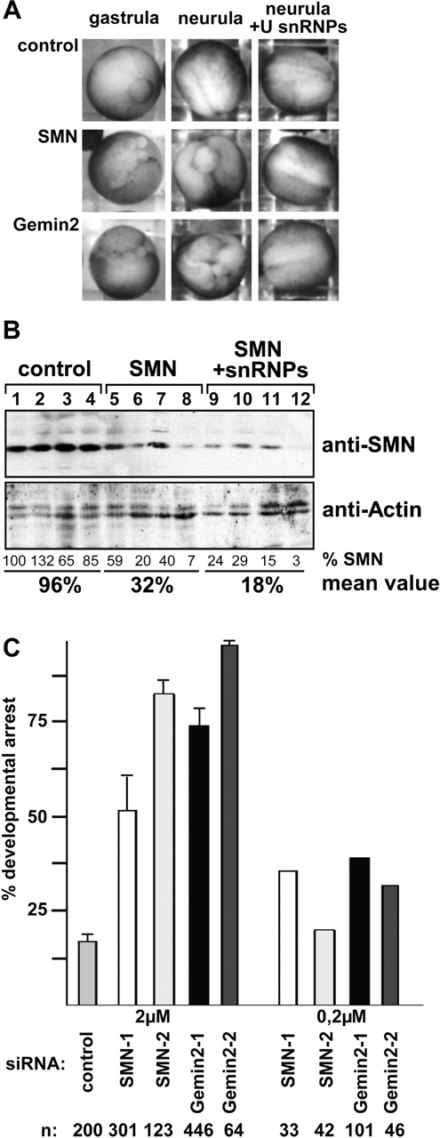 Figure 3. SMN and Gemin2 are essential for the development of Xenopus embryos. (A) SiRNAs complementary to SMN or Gemin2, or nonspecific siRNAs were injected into X. laevis embryos, and survival was scored at gastrula (left column) or neurula (middle and right columns). Dead or developmentally arrested embryos display an abnormal outgrowth of white cell mass. (B) Western blot analysis of the SMN level in embryos treated with control (lanes 1-4) or SMN-siRNAs (lanes 5-8) in comparison to actin levels. Analyses of embryos that received a coinjection of U snRNPs (see also legend for Fig. 4 for details) are shown in lanes 9-12. Each lane represents an individual embryo. Relative SMN expression levels were estimated by densitometry in comparison to actin levels. (C) Quantification of the injection studies shown in A. Results are shown for two siRNA concentrations (2 and 0.2 μM) and two different siRNAs per target. The numbers of examined embryos (n) are indicated below each row.