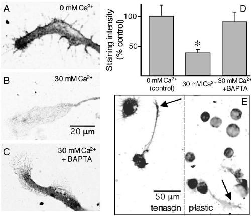 different from 0 mMCa2+ and 30 mM Ca2+ plus BAPTA (p < 0.05). (E) pFAK staining is more intense in cells grown in 2 mMCa2+ on tenascin where LLTs are absent