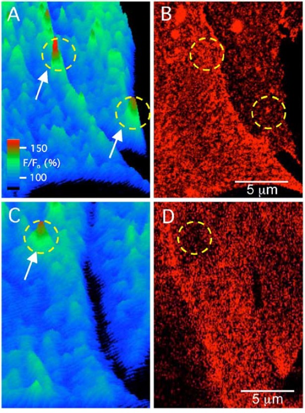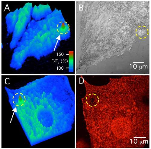 obtained from 5 of 5 cells. (C) Surface plot of fluo-4 fluorescence in another
