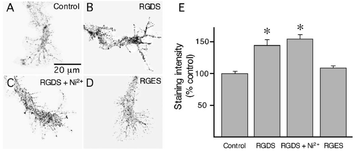 intensity is significantly increased in cells incubated with the integrin activating peptide RGDS for 5 min prior to fixation. This effect is not blocked by the prior