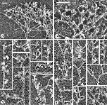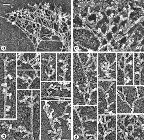 Figure 2. Improved visualization of actin filament branching in lamellipodia. EM of keratocyte or fibroblast lamellipodial actin network after CD treatment (a and b, 0.2 μM for 30 min or 0.5 μM for 10 min), 1 min recovery from serum starvation of a mouse fibroblast (c), LA treatment (0.2 μM for 10 min), or unprotected extraction (d). All examples demonstrate frequent branching of actin filaments. Bars, 0.1 μm; b and d are shown at the same magnification as c. |