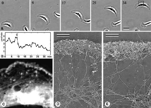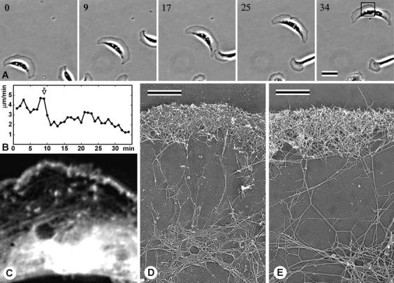 Figure 7. Differential response of lamellipodial actin network to LA. (A) Phase-contrast sequence of a locomoting Xenopus keratocyte. After addition of 0.1 μm LA at 9 min time point, the cell continued to translocate, retaining the crescent-like shape. (B) Plot showing rate of front edge protrusion versus time of the cell shown in A. LA addition (arrow) decreased rate of protrusion from ∼4 μm/min before LA application to 1 μm/min at the end of the sequence. (C) Fluorescence microscopy of the boxed region of the cell shown in A, which was lysed at 34 min time point, fixed, and stained with TRITC-phalloidin. Actin-staining reveals narrow bright lamellipodium at the leading edge, separated by the wide actin-depleted zone from the internal actin structures. (D and E) EM of a Xenopus keratocyte (D) or Xenopus fibroblast (E) lamellipodium treated with LA (D, 0.1 μM for 30 min; E, 0.25 μM for 10 min) reveals actin depletion from the lamellipodial rear. Bars: (A) 10 μm; (D and E) 1 μm. |