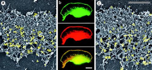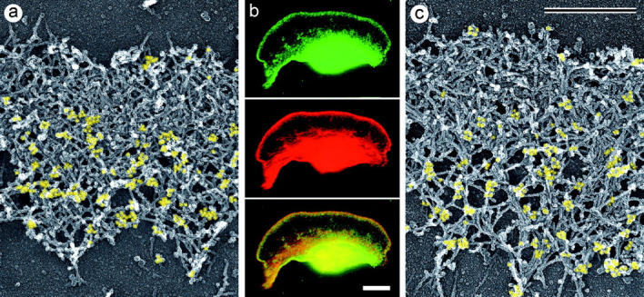 Figure 9. Localization of XAC to posterior regions of depolymerization-resistant actin brush. Electron (a and c) and fluorescence (b) microscopy of lamellipodia of Xenopus keratocytes after unprotected extraction (a) or LA treatment (b, 0.15 μM for 30 min; c, 0.25 μM for 10 min) and subsequent staining with XAC antibody (a and c) or double staining with TRITC-phalloidin and XAC antibody (b). |