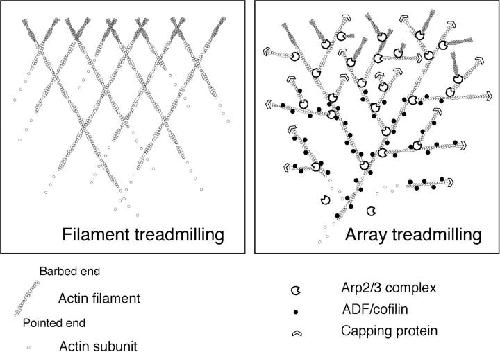 Figure 11. Two treadmilling models for actin turnover in lamellipodia. Left, treadmilling of individual filaments suggests that each actin filament in the actin network simultaneously assembles subunits at its barbed end and releases subunits from the pointed end, thus continuously reproducing itself by treadmilling mechanism. Treadmilling of individual filaments collectively results in the treadmilling of the lamellipodial network. Right, treadmilling of the dendritic array suggests frequent formation of new filaments by de novo nucleation, which occurs within the narrow zone at the leading edge, the actin brush. Newborn filaments become immediately incorporated into the actin array as branches of pre-existing filaments. Within the actin brush, filaments are protected from depolymerization at pointed ends. Nucleation, cross-linking, and pointed end capping are proposed to be mediated by the Arp2/3 complex. Many barbed ends are predicted to be capped to prevent exponential increase in filament mass. Release of the Arp2/3 complex from Y-junctions behind the actin brush, followed by ADF/cofilin-mediated dissociation of actin subunits from pointed ends, may be a major pathway for actin array disassembly. By this model, an individual filament in the dendritic array does not treadmill, but rather first grows at the barbed end and later shrinks at the pointed end. However, the actin filament array as a whole treadmills, reproducing itself at the cell front and dismantling itself at the lamellipodial rear. Growing barbed ends are shaded in gray. |
