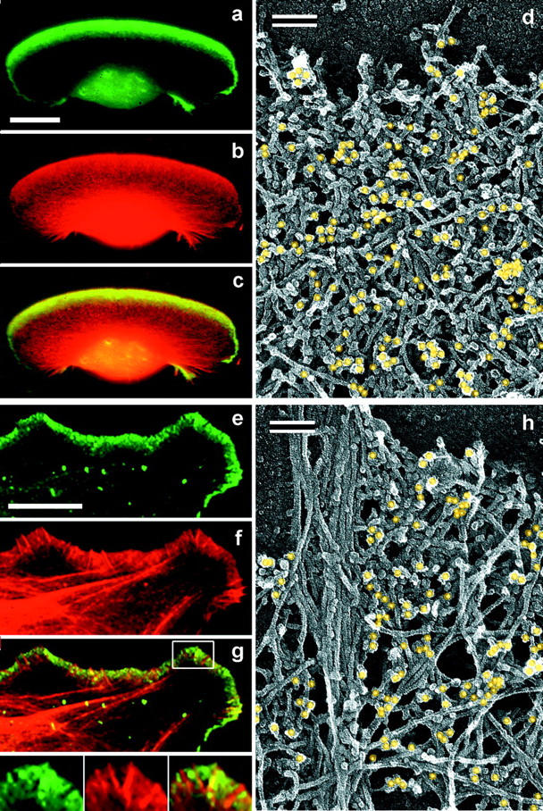 Figure 3. Localization of Arp2/3 complex in lamellipodia. (a–c and e–g) Fluorescence microscopy of Xenopus keratocyte (a–c) or fibroblast (e–g). Staining with p21 antibody (green) and TRITC-phalloidin (red) shows ARP2/3 complex highly enriched in lamellipodia. Boxed region in g is enlarged in insets; it shows several filopodia lacking and only one filopodium containing Arp2/3 complex. (d and h) Immuno-EM of lamellipodia of Xenopus keratocyte (d) or fibroblast (h) stained with p21 primary antibody and 10-nm gold-conjugated secondary antibody after glutaraldehyde fixation and SDS treatment of detergent-extracted cells. Gold particles are highlighted in yellow. Bars: (a and e) 10 μm; (d and h) 0.1 μm. |