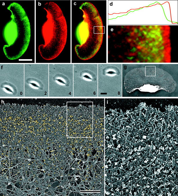 Figure 8. Localization of XAC in Xenopus keratocytes. (a–e) Fluorescence microscopy of a whole cell (a–c) and the intensity profile (d) of the enlarged lamellipodium (e) from the boxed region in c, double stained with XAC antibody (green) and TRITC-phalloidin (red). XAC in lamellipodium is excluded from the narrow zone at the extreme leading edge. (f) Phase-contrast sequence of a locomoting cell; time is shown in min. (g–i) Immuno-EM with XAC antibody of the cell shown in f, which was lysed and processed at 8 min time point. (g) Cell overview. (h) Intermediate magnification of the boxed region from g showing distribution of gold particles (yellow) in lamellipodia. (i) High magnification of the boxed region from d showing leading edge. XAC is excluded from the extreme front of the lamellipodium (h and i). Bars: (a and f) 10 μm; (h) 10 μm. |