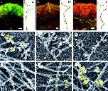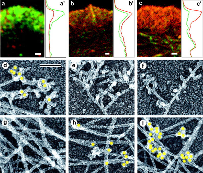 Figure 5. Localization of cross-linking proteins in fibroblast cytoskeleton. (a–c) Fluorescence microscopy and corresponding intensity profiles (a′–c′) of Xenopus (a and c) or human 356 (b) fibroblast lamellipodia double stained with TRITC-phalloidin (red) and either p21 (a and a′), ABP-280 (b and b′), or α-actinin (c and c′) antibodies (green). The protein/actin ratio at the leading edge of the lamellipodium is high for Arp2/3 complex (a and a′), medium for ABP-280 (b and b′), and low for α-actinin (c and c′) compared with internal actin structures. (d–i) Immuno-EM of the cell edge (d–f) or interior (g–i) of CD-treated Xenopus (d, f, g, and i) or human 356 (e and h) fibroblasts stained with p21 (d and g), ABP-280 (e and h), or α-actinin (f and i) primary antibody and 10-nm (d, e, g, and h) or 18-nm (f and i) gold-conjugated secondary antibody. Gold particles (yellow) reveal Arp2/3 complex at Y-junctions at cell edge and ABP-280 and α-actinin at filament crossovers in the cell interior. Bars: (a–c) 1 μm; (d–i) 0.1 μm. |