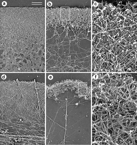 Figure 6. Structural differentiation of actin network in lamellipodium. EM of Xenopus keratocytes (a–c) or Xenopus fibroblasts (d–f) after regular extraction in the presence of PEG and phalloidin (a and d) or after unprotected extraction without PEG and phalloidin (b, c, e, and f). Boxed areas from b and e are enlarged in c and f, respectively. Actin network at lamellipodial rear disassembled in the course of unprotected extraction, whereas front zone remained as dense as in control cells. Bar, 1 μm. |