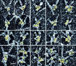 Figure 4. Localization of Arp2/3 complex at actin filament branching points. Xenopus keratocytes and fibroblasts were treated with CD (0.2 μM for 30 min or 0.5 μM for 10 min), extracted in the presence of phalloidin, fixed with glutaraldehyde, treated with 33% methanol, and immunostained with p21 antibody followed by 10-nm gold-conjugated secondary antibody. Gold particles are highlighted in yellow. Bar, 50 nm. |